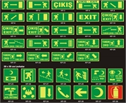 Işıksız ortamda çekilmiş lümen fosforlu acil uyarı levhalarının görünümleri